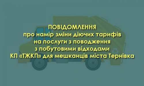 ПОВІДОМЛЕННЯ про намір зміни діючих тарифів на послуги з поводження з побутовими відходами КП «ТЖКП» для мешканців міста Тернівка